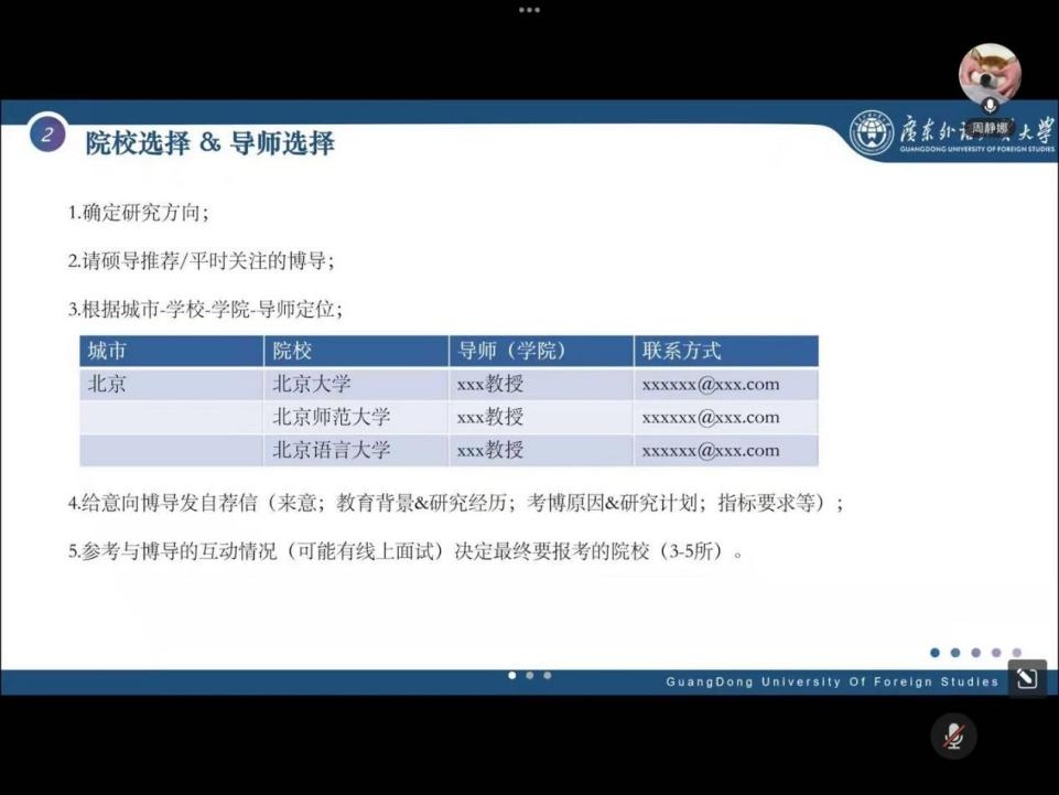 周静娜结合自身申博经历,以“院校与导师选择”“申博流程与材料准备”“读博原因与感受”三大板块为主线展开讲解。在择校策略方面,她建议应“先确定研究方向、再请导师推荐、最后按城市—院校—导师进行分层定位”。同时,她建议通过撰写针对性强的自荐信提前与意向导师建立联系,并推荐以3至5所院校为目标进行合理规划与有序联系。