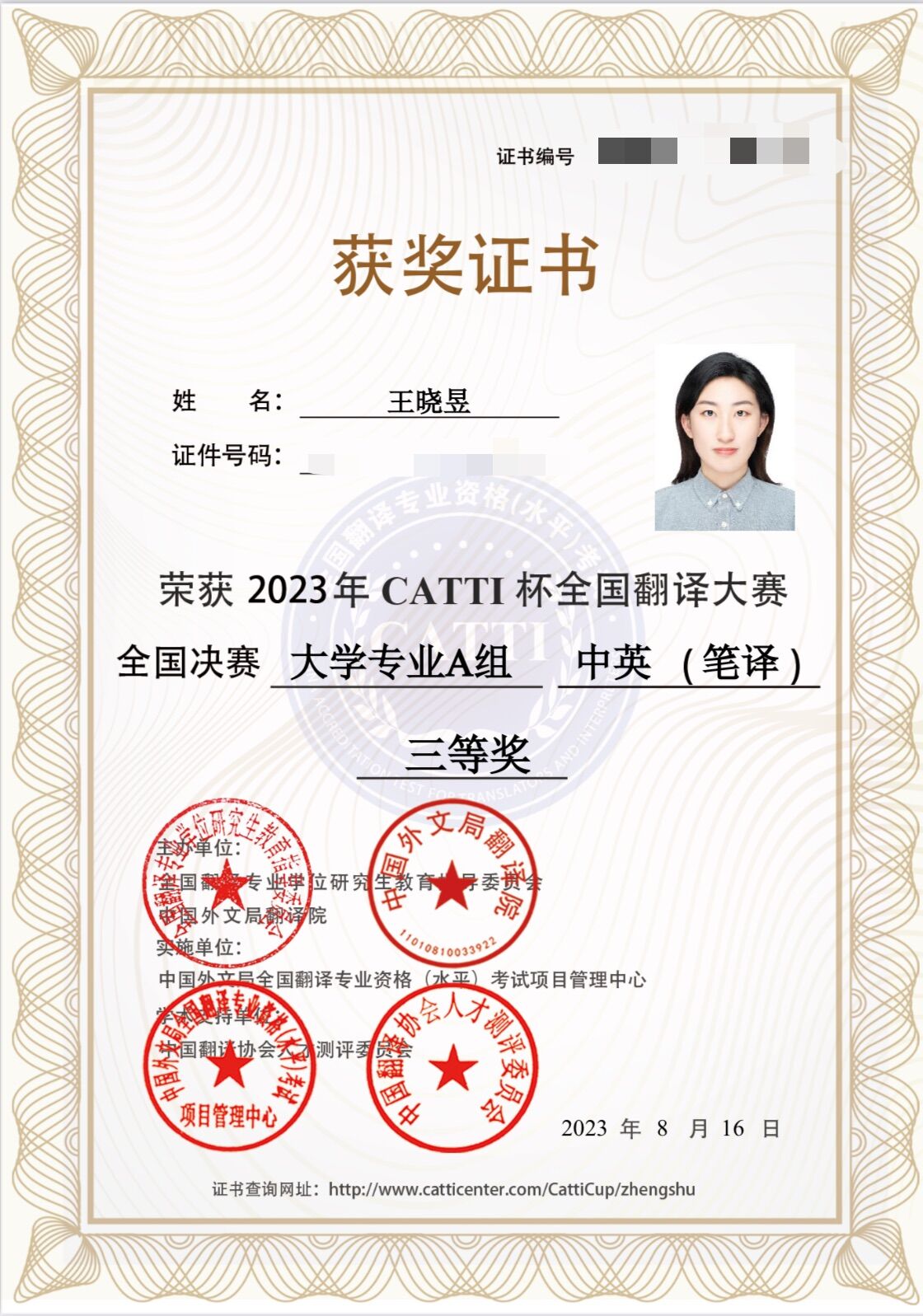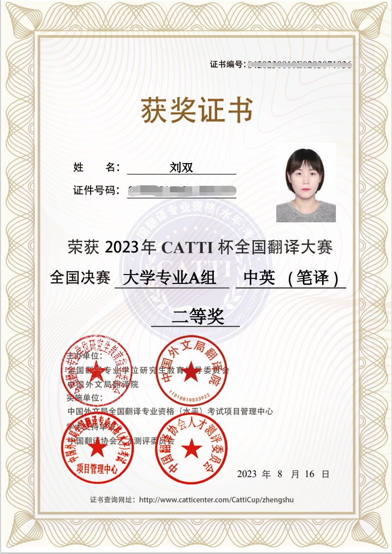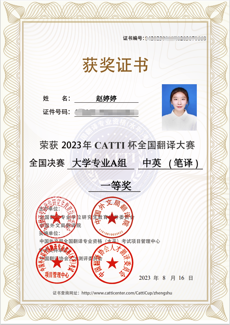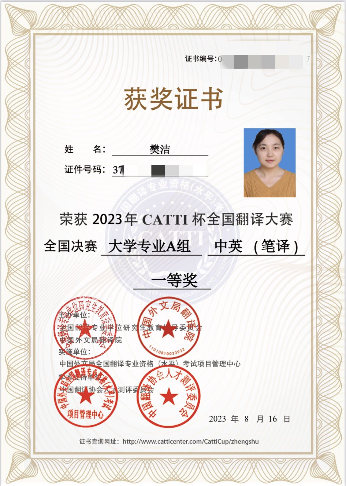 近日,由全国翻译专业学位研究生教育指导委员会和中国外文局翻译院主办、中国外文局CATTI项目管理中心负责实施的2023年“CATTI杯”全国翻译大赛全国决赛获奖名单揭晓,我院研究生荣获佳绩,共获大学组4项奖励。