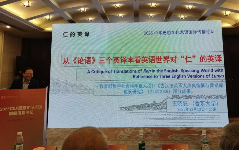 12月12日,2025中华思想文化术语国际传播论坛在北京召开。北京外国语大学校长、党委副书记贾文键,教育部语言文字信息管理司司长刘培俊,中国外文局副总编辑、当代中国与世界研究院院长李雅芳,北京外国语大学党委常委、副校长丁浩等出席开幕式。开幕式由外研集团(外研社)党委书记、董事长,外研社社长王芳主持。鲁东大学中华文化典籍与当代学术经典外译研究中心主任王晓农教授应邀参加了本次论坛。